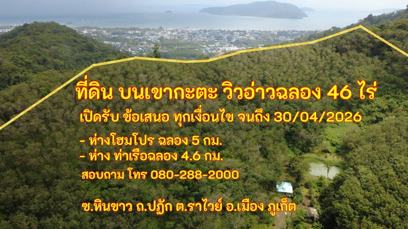 ที่ดิน บนเขากะตะ วิวทะเล อ่าวฉลอง เนื้อที่ 46 ไร่ ราคายังไม่กำหนด ยินดีเปิดรับทุกข้อเสนอ ซ. หินขาว ถ. ปฏัก ต. ราไวย์ อ.เมือง จ. ภูเก็ตl นารา แอสเสท 080-288-2000